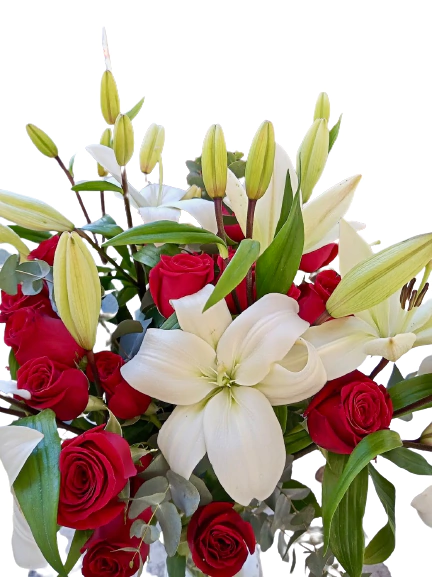 Presentamos el RO24 - Arreglo Floral de Rosas y Lilium, una combinación extraordinaria de 2 docenas de rosas rojas y 5 varas de liliums blancos, acompañadas de un delicado follaje. Este elegante arreglo llega en un florero de vidrio y nuestro exclusivo packaging, ideal para expresar tus sentimientos con estilo y sofisticación.